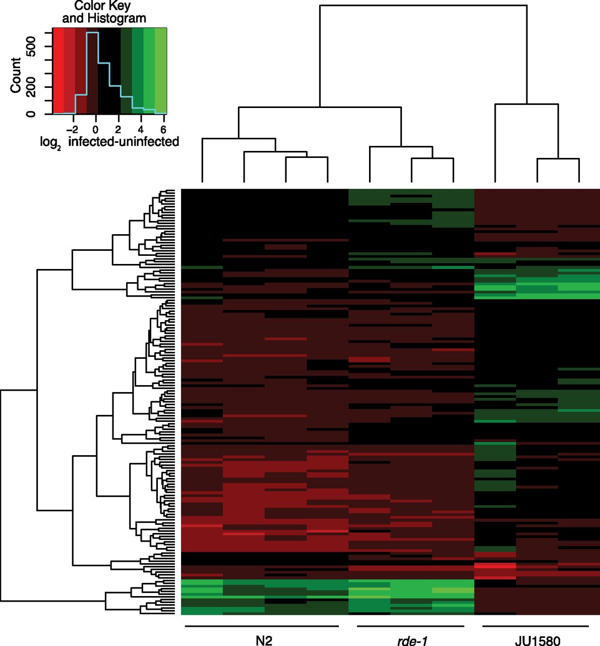 Heatmap showing changes in gene expression upon viral infection. The heatmap shows all the genes that change by more than twofold in at least one strain after infection (t-test, P < 0.05). The changes that occur in each infected biological replicate (vertical lanes) relative to the mean value of all biological replicates of that strain without infection are indicated by the color on the red–green scale.