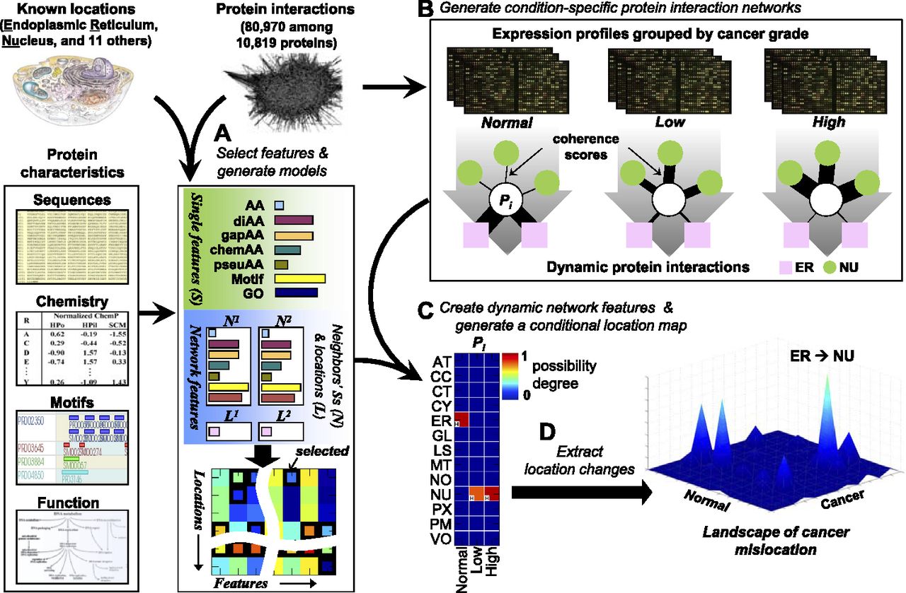 Proteome-wide prediction of protein mislocation. (A) A protein is described by its sequence, chemical properties, motifs, and functions (single protein features) together with a description of its network neighborhood (capturing the features of its neighbors and their subcellular locations, if known). The best combination of features for each location is selected using a DC-kNN classifier. (B) Condition-dependent dynamic network features are generated by assigning different weights to each neighbor of a protein, depending on their similarity in gene expression profiles. (C) Selected features from A are combined with condition-dependent networks from B to compute a CLM for the protein, listing the quantitative possibility that the protein is in each location under each condition. (D) Mislocations are identified by calculating differences in degrees of possibility across conditions.