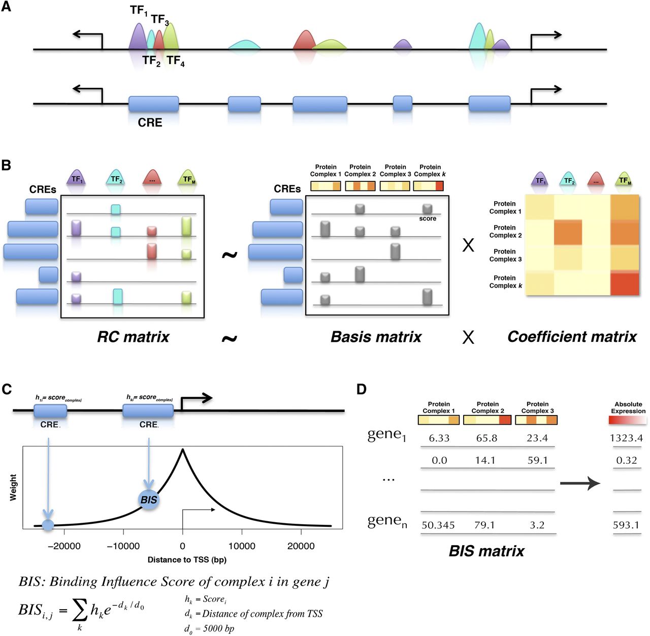 Modeling gene expression from combinatorial binding. (A) Peaks from multiple experiments (TFs, HMs) are merged into nonoverlapping CREs, within the same cell type. (B) For each CRE, the normalized reads intensity in each experiment is estimated. The RC matrix is then produced, representing the CREs in rows, and the reads' intensity profiles of different experiments in columns. NMF analysis is applied to the RC matrix, to group the M experiments of TFs and HMs into k complexes. NMF decomposes the RC matrix into the basis matrix and the mixture coefficient matrix. The basis matrix contains the coefficient of each CRE in a complex (also called complex score), while each complex represents a positive linear combination of the original read count variables for each experiment (coefficients matrix). (C) The CREs that occur within a fixed-range window around a TSS are estimated. Then, the complex scores and the proximity of the CREs to the TSS of a gene are integrated into a Binding Influence Score (BIS) between a protein complex and a gene. d0 is a constant used to specify the shape of the exponential function (see Methods). (D) The BIS values are used as predictors to assess the contribution of protein complexes to gene expression in regression models.