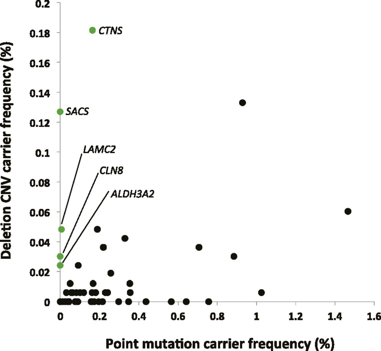 Comparison of deletion carrier frequency in our cohort to point mutation carrier frequency reported by Lazarin et al. (2013). Values are derived from Supplemental Table S10. SNV and deletion carrier frequencies for a given gene are poorly correlated (Spearman correlation coefficient = 0.122; P[estimated] = 0.399). Genes for which deletion carrier frequency is higher than SNV carrier frequency are labeled and in green.