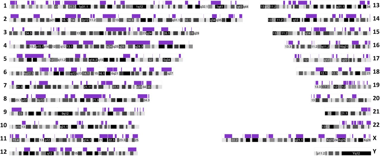 Two hundred ninety-four chromosomal regions contain “consecutive” recessive disease genes. A homozygous or hemizygous deletion containing two or more recessive disease genes not interrupted by a dominant or rec/dom disease gene could lead to a complex recessive phenotype (i.e., a recessive contiguous gene syndrome); heterozygous deletion of the same region may render an individual a carrier for two or more recessive conditions. Such “consecutive” recessive disease genes are indicated by the purple bars above each chromosome, which span from the start of the first recessive disease gene in the series to the end of the last one. Selected chromosomal bands are numbered for locational reference.