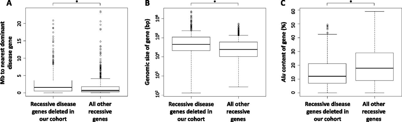 Features of recessive disease genes deleted in our cohort. The 419 recessive disease genes deleted at least once by a Tier 1 heterozygous CNV were compared with all other recessive disease genes. Those deleted in our cohort are (A) farther from the nearest dominant disease gene (P = 3.3 × 10−15); (B) larger, genomically (P = 9.3 × 10−16); and (C) had a lower fractional Alu content (P = 2.3 × 10−11) than the remaining recessive disease genes. All P-values result from the Wilcoxon rank sum test with continuity correction.
