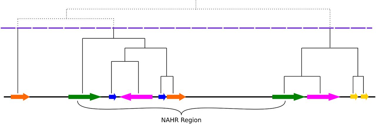 Schematic representation of LCR clustering. Horizontal arrows indicate LCR elements and their orientation; the same color represents a pair of paralogous LCRs. A hierarchical clustering tree is depicted above; the dashed horizontal line (violet) shows the height threshold for cutting this tree. Directly oriented paralogous LCRs (DP-LCRs) can potentially mediate NAHR events. The structure of LCR clusters (subunit structure, orientation, etc.) as well as the DNA sequence homology between LCR clusters flanking NAHR-prone regions often revealed extensive complexity, in contradistinction to the concept of a “segmental duplication” and more consistent with “complex LCR clusters” and with current accepted models for generating duplications and complex genomic rearrangements; e.g., FoSTeS (Lee et al. 2007) or MMBIR (Hastings et al. 2009) (Supplemental Fig. S1).