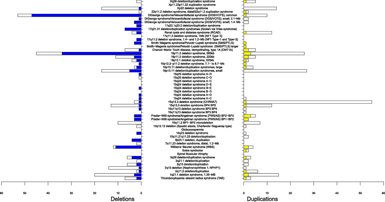 Known recurrent CNVs found in the MGL BCM CMA database divided into de novo (colored) and inherited (white), excluding ∼75% of events of unknown parental origin (i.e., no parental study was performed). Among de novo events, more deletions were found than reciprocal duplications.