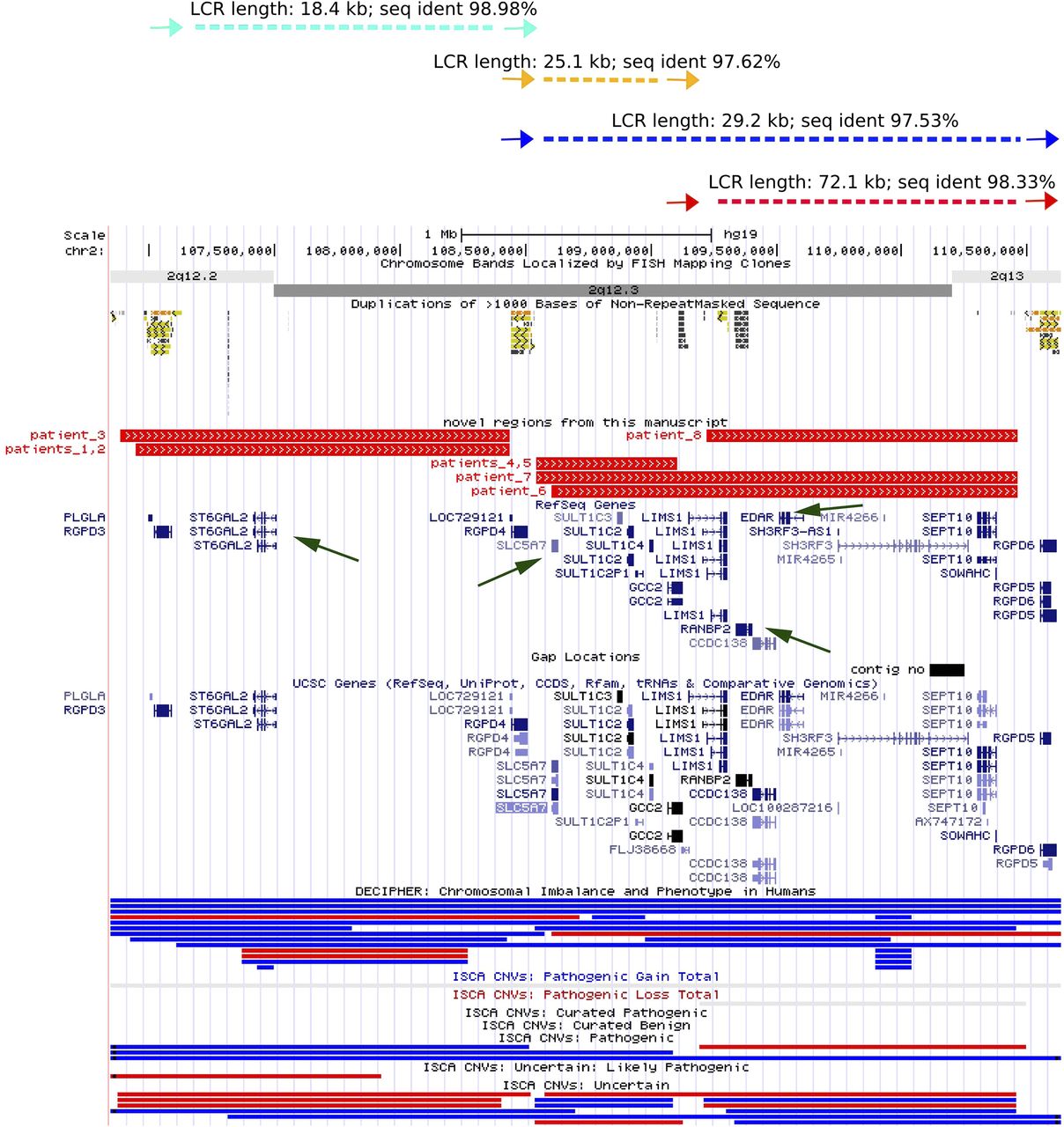 Four novel NAHR-prone regions on chromosome 2q12.2q13. (Top) Schematic representation of paralogous DP-LCRs (colored arrows) with their sequence homology and distance in between. UCSC display of LCR clusters and deletion CNVs found in patients 1–8 (middle) and deletion (red) and duplication (blue) CNVs from the DECIPHER and ISCA databases (bottom). Green arrows indicate the ST6GAL2, SLC5A7, EDAR, and RANBP2 genes proposed to contribute to the patients' phenotypes.