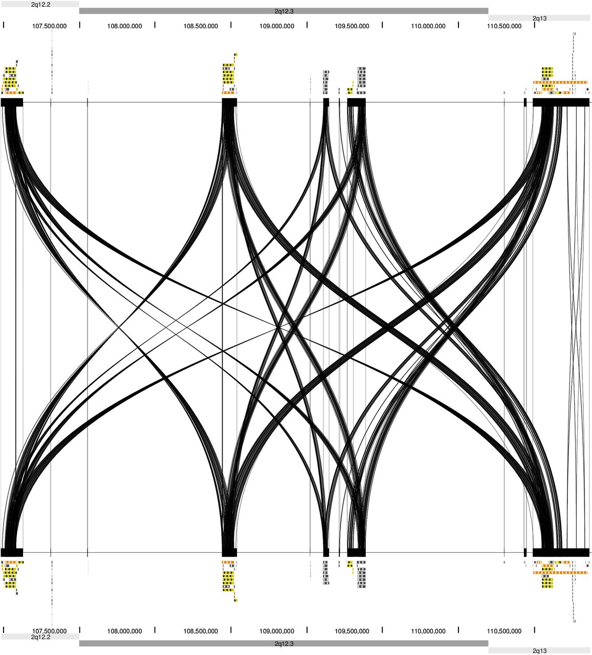 DNA sequence homology between four LCR clusters in the 2q12.2q13 region (chr2:106,985,338-110,870,754) for paralogous subunits larger than 1 kb in size (hg19). (Top and bottom) UCSC Segmental Duplications (segdup) track representing the 2q12.2q13 region. (Middle) Results of Miropeats program analysis among all four clusters.