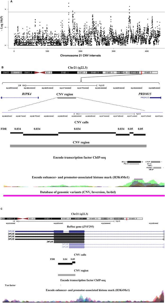 (A) Chromosome 21–wide Manhattan plot of P-values for DS-AVSD across 4401 consecutive chromosomal regions for CNV association. The P-values are calculated by a two-by-three Fisher's exact test. (Horizontal line) The FDR threshold for chromosome 21–wide α ≤ 0.05; CNV tests are plotted in equidistance. Three CNV regions reached genome-wide significance (FDR ≤ 0.05). (B) Overview of the CNV1 region (Chr21: 42,066,443–42,071,313) 6 kb upstream of the RIPK4 gene. This 4870-bp CNV region (in gray) is defined by merging six contiguous CNV tests (in black) (for details, see text). CTCF, REST, and other transcription factor binding sites are present in this region as well as the histone mark H3K4me1 (data from http://genome.ucsc.edu/ENCODE/). Additionally, an inversion (in pink), reported in the database of genomic variation, overlaps with this CNV region. (C) Overview of the 1820-bp CNV2 region (Chr21: 42,284,480–42,286,300) defined by merging two contiguous CNV tests overlapping with the last exon of the ZBTB21 gene.