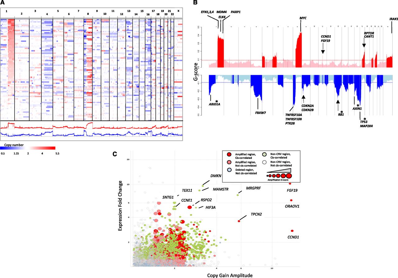 Landscape of genomic copy number alteration in HCC. (A) Shown is a genome-scale overview of copy number segments across 88 HCC samples rendered by IGV (Robinson et al. 2011). Each track in the upper panel represents one tumor sample, and the lower panels show the amplification and deletion G-score profiles across the genome. (B) Shown is a chromosomal overview of amplification and deletion peaks with the locations of putative cancer driver genes indicated. Arrows indicate focal peaks (<100 kb). Asterisks indicate genes also harboring nonsense mutations. (C) A log-scale plot of gene-level expression fold-change in CNV relative to non-CNV samples versus amplitude of copy gains. Genes with strong increase in expression driven by copy gains are labeled. Colors and shadings were used to indicate the CNV and cis-correlation statuses of genes. The size of the marker is proportional to the amplification G-score.