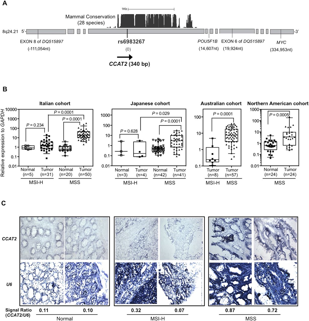 CCAT2, a novel lncRNA spanning rs6983267, is overexpressed in colorectal cancer samples. (A) Genomic features of the 8q24.21 region spanning SNP rs6983267 and the genomic location of CCAT2. Numbers in parentheses show the genomic distance relative to rs6983267 (image not to scale). (B) CCAT2 expression in CRC patient samples. CCAT2 expression was quantified using qRT-PCR, and data are presented as box-whisker plots showing the five statistics (lower whisker is 5% minimum, lower box part is the 25th percentile, solid line in box represents the median, upper box part is 75th percentile, and upper whisker is 95% maximum). (C) In situ hybridization of CCAT2 and RNU6-6P (U6) (as normalizer) in CRC patient samples.