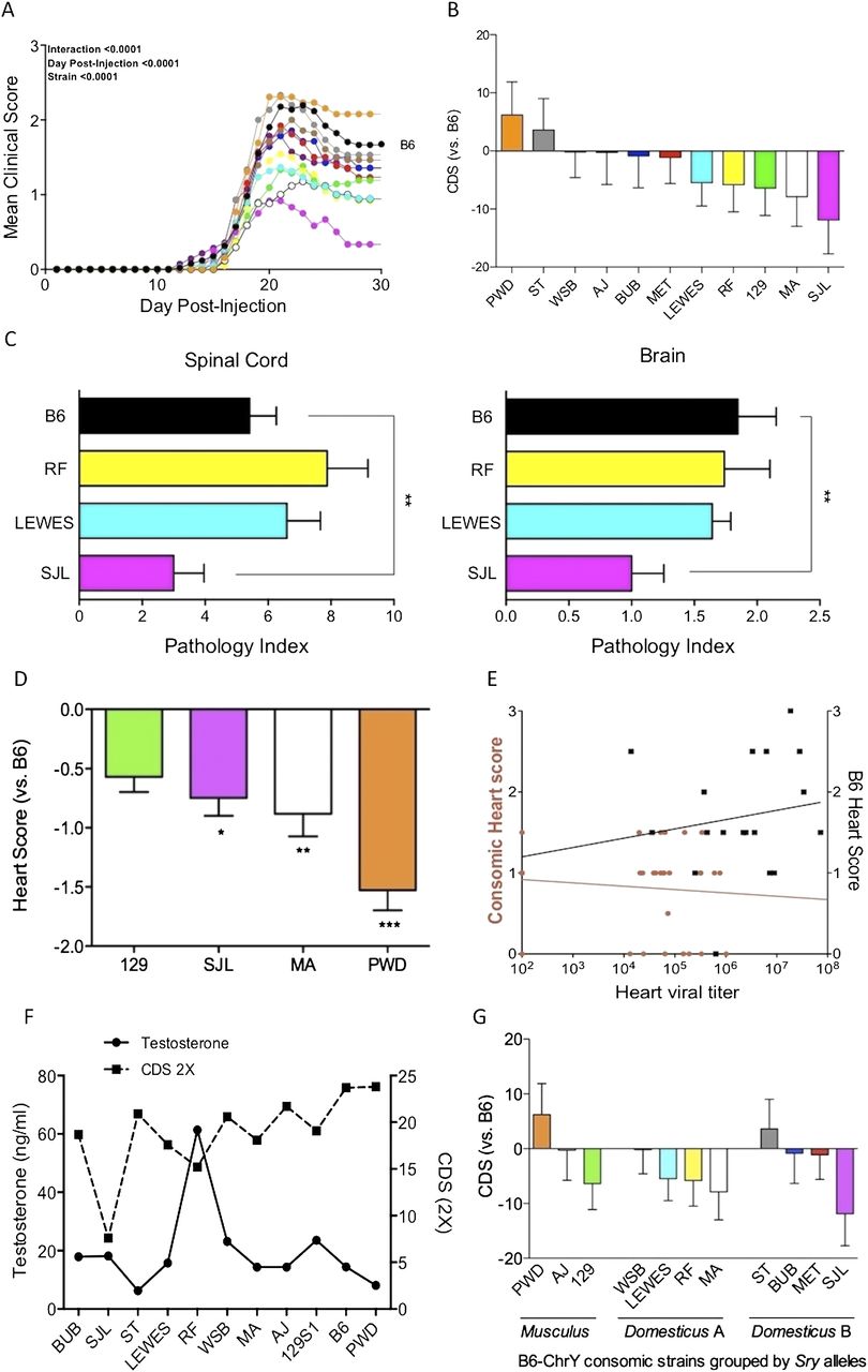Natural genetic variation in ChrY mediates susceptibility to autoimmune disease. (A) Male mice from the B6–ChrY consomic strains were immunized with MOG35–55 using the 2× protocol and the clinical score was monitored over 30 d. The consomic strain represented by each line is color-coded with the bar graph in B. Wild-type B6 male are represented by black circles. The significance of the differences in disease course among the strains was determined by two-way ANOVA (interaction [F = 1.18; DFn = 319; DFd = 7770; P = 0.02], day post-injection [F = 132.81; DFn = 29; DFd = 7770; P < 0.0001], and strain [F = 23.53; DFn = 11; DFd = 7770; P < 0.0001]). (B) The degree of EAE susceptibility among the B6–ChrY consomic mice was calculated by subtracting the clinical disease score (CDS) of B6 from the CDS of each strain. The x-axis indicates the strain origin of the Y chromosome. F = 2.58, P ≤ 0.0009. A heterogeneity test was used between cohorts of mice with no significant differences detected. Thus, data were pooled from three independent experiments and the total number of animals analyzed in A and B are indicated in Supplemental Table S1. (C) Immunohistopathology of the brain and spinal cord from B6–ChrY consomic strains immunized using the 2× protocol. Only the total histopathology score is shown. Significance determined by one-way ANOVA. (**) P ≤ 0.01. (D) Male mice from wild-type B6 and four consomic lines were infected with 50 PFU CVB3 and their hearts were evaluated for myocarditis. Heart score of B6 was subtracted from the heart score for each consomic. Labeling on the x-axis represents the strain donating ChrY to B6. Results are representative of three individual experiments. n ≥ 5 mice per strain. Significance determined by one-way ANOVA and Dunnett's multiple comparison test. (*) P ≤ 0.05; (**) P ≤ 0.01; (***) P ≤ 0.001. (E) Linear regression analysis of heart score and heart viral titers reveals the absence of a significant relationship between the regressed variables. Left x-axis (orange linear regression line and orange circles) corresponds to the B6–ChrY consomic data combined from each of the four tested strains. F = 0.72, P = 0.41. Right x-axis (black linear regression line and black squares) corresponds to the WT B6 data. F = 0.43, P = 0.52. (F) Correlation analysis of serum testosterone with the CDS for EAE (r = 0.36; P = 0.27). (G) Functionally significant Sry polymorphisms are discordant with ChrY-mediated differences in disease susceptibility. Data from B were grouped according to their functional Sry polymorphisms.