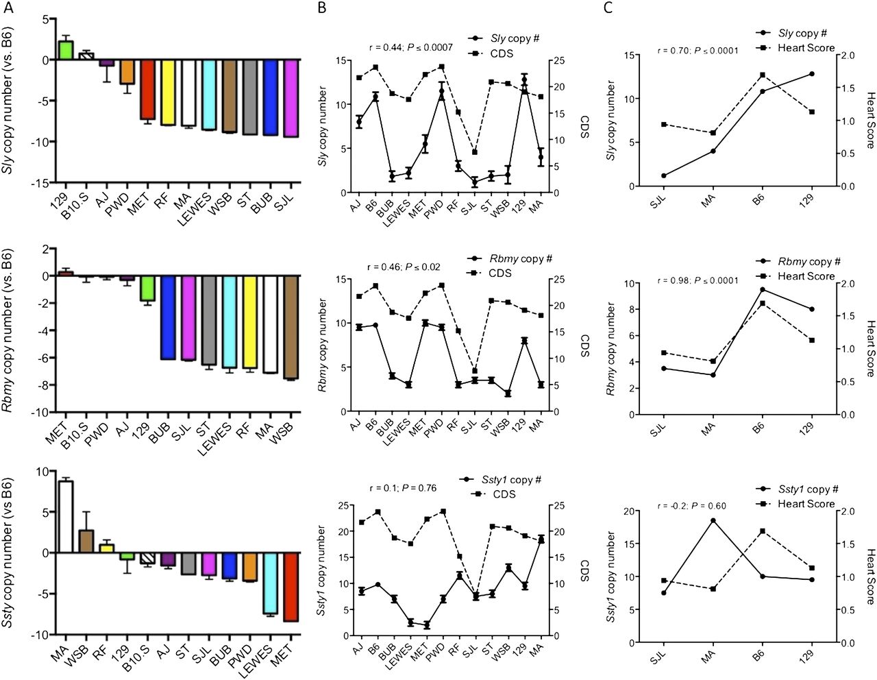Sly and Rbmy gene copy number correlates with EAE and CVB3 susceptibility among B6–ChrY consomic strains. (A) Gene copy number for each of the consomic strains relative to B6. n ≥ 5 mice per strain. (B) Correlation analysis of gene copy number with the CDS for EAE. (C) Correlation analysis of gene copy number with myocarditis heart score. The x-axis represents the strain origin of ChrY.