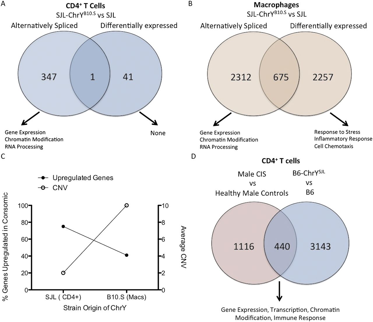 ChrY preferentially regulates the transcriptome of macrophages compared with CD4+ T cells in the SJL genetic background. Venn diagram representing the number of genes passing an FDR < 0.05 between SJL–ChrYB10.S and SJL. (A) CD4+ T cells and (B) macrophages. MGI GO Term Finder was used to identify enriched biological processes associated with each gene list, examples of which are shown. (C) Graph representing the percentage of up-regulated genes in the ChrY consomic strain vs. the parental in relation to the averaged copy number variation for Sly and Rbmy. (D) A Venn diagram representing the genes differentially regulated between the human and B6 mouse CD4+ T-cell microarrays, 440 of which are shared between the two species. MGI GO term analysis on these shared terms identified an enrichment of genes involved in gene regulatory processes.