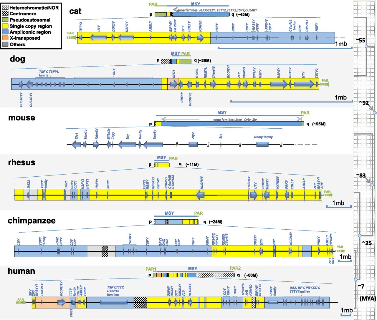 Schematic representation of the MSY chromosome gene content of six mammals. Different gene/sequence classes are displayed in different colors (roughly following Skaletsky et al. 2003; Hughes et al. 2005, 2010, 2012 for clarity). Mouse physical mapping data are from Mazeyrat et al. (1998). Each sequence schematic is drawn to a different scale to emphasize differences in single-copy X-degenerate gene compaction.
