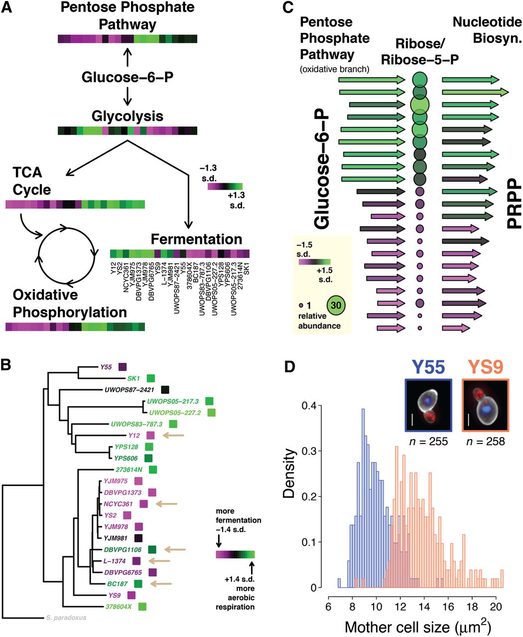 Pervasive heritable phenotypic variation. (A) Overview of central carbon metabolism, with heatmaps indicating pathway activity by strain. Transcript and protein data for genes in each pathway was combined, the first principal component extracted, and the numerical sign adjusted to ensure higher numbers corresponded to higher average transcript and protein abundance across the pathway. Order of strains is listed under the fermentation heatmap. (B) Phylogeny based on complete genome sequences, with strain names colored according to the key shown. Tan arrows indicate strains used in the fermentation of alcoholic beverages. Pathway activity for strains was calculated as in A, using genes in the tricarboxylic acid cycle (TCA cycle) and involved in fermentation. (C) Pathways leading to the production of phosphoribosyl pyrophosphate (PRPP) from glucose-6-phosphate, with pathway activity displayed vertically for 21 strains (Supplemental Note). Arrows represent pathway activity calculated as in A, with longer arrows/green indicating higher activity and shorter arrows/magenta indicating lower activity. Arrows on left indicate pathway activity of the oxidative branch of the pentose phosphate pathway, and on right activity of 5-phospho-ribosyl-1(alpha)-pyrophosphate synthetase, the heteromultimeric complex that synthesizes PRPP. Circles represent measurements of ribose/ribose-5-phosphate and are colored and sized accordingly. (D) Differences in mother cell size between a small and large strain. Histograms are composed of measurements made on individual cells. Inset photos show a typical cell from each strain (with size near the strain mean). White scale bars show ∼2 μm. Actin stain is shown in red, DNA stain in blue, and cell wall stain in greyscale in the merged images.