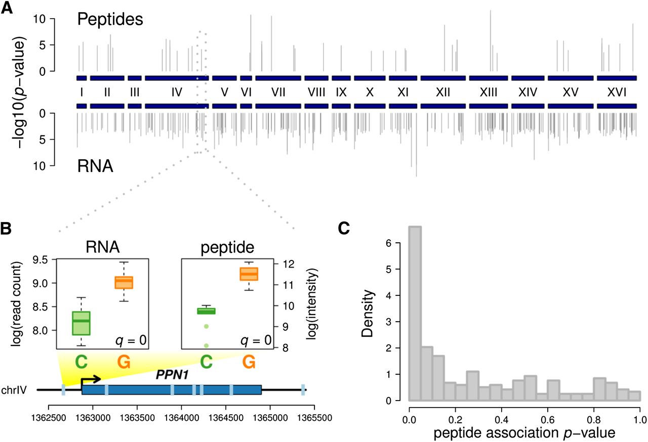 Cis-regulatory transcript and peptide QTL. (A) Manhattan plot showing results for significant (FDR = 5%) transcript and peptide cis-association tests. Gray vertical lines indicate individual tests. Blue boxes and associated roman numerals across the middle of the panel indicate the 16 chromosomes of yeast. (B) Transcript and peptide levels association with the same polymorphism. Light blue ticks along gene model indicate locations of tag SNPs tested for association. Transcript and peptide levels are significantly associated with the first SNP. Yellow gradient originating at first SNP expands to boxplots of transcript and peptide levels separated by allele; boxes indicate lower quartile, median, and upper quartile, and whiskers extend to half the interquartile range. (C) Histogram of P-values for 236 peptide associations in 69 genes with significant transcript associations.