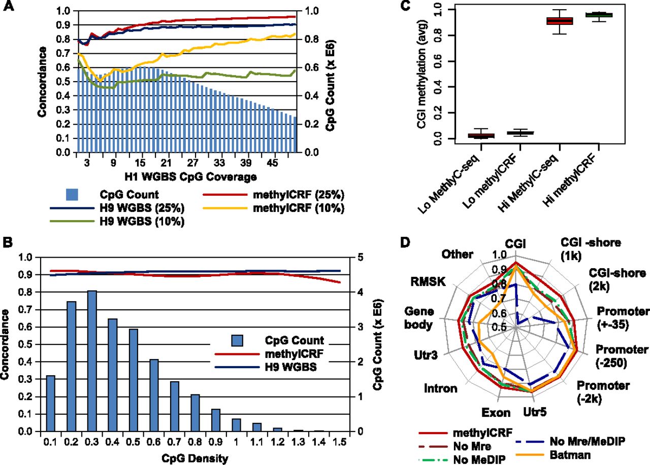Factors affecting concordance between MethylC-seq and methylCRF. (A) Concordance with MethylC-seq as a function of MethylC-seq read count (CpG coverage) at 10% and 25% windows for both methylCRF and BS-seq. The right y-axis (blue bars) indicates the number of CpGs with that coverage. (B) Concordance with MethylC-seq as a function of CpG density at 25% windows for both methylCRF and BS-seq. (C) Concordance of methylCRF within a 25% window broken out by annotated genomic features when only MeDIP-seq, MRE-seq, or genomic features are used. Concordance of BATMAN using MeDIP-seq is also plotted for comparison. (D) methylCRF accuracy on CGIs with high or low methylation (as defined by MethylC-seq). The Lo set of CGIs are those with an average CpG methylation ≤0.2, while the Hi set are those with an average methylation ≥0.8.