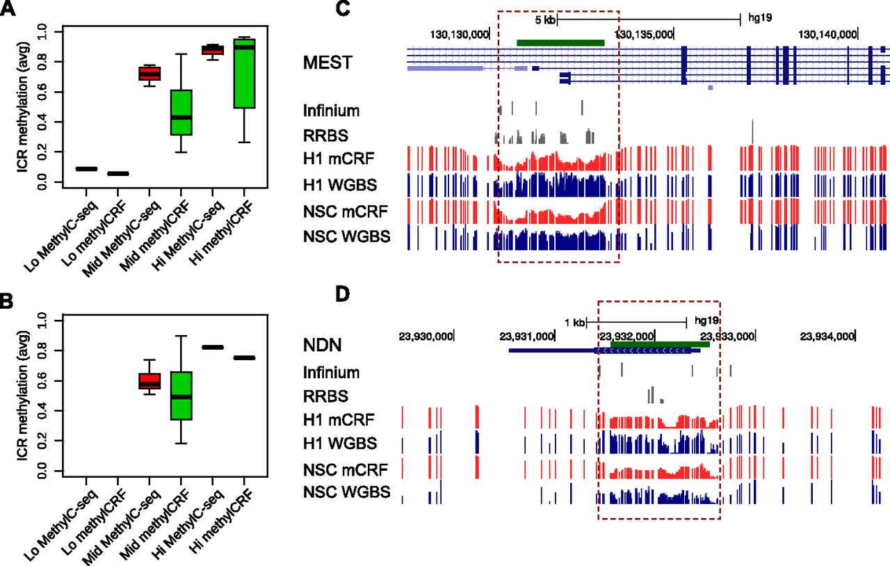 Comparing methylCRF and WGBS predictions in imprinted control regions. (A) Known imprinted control regions (ICRs; https://atlas.genetics.kcl.ac.uk) (Supplemental Table 2) were grouped based on WGBS data (H1 ESC, MethylC-seq), as “Lo” (average methylation ≤0.2), “Mid” (average methylation between 0.2 and 0.8), and “Hi” (average methylation ≥0.8). Boxplots represent average methylation levels of these ICRs based on MethylC-seq and methylCRF. (B) Same as A, except for fetal NSCs. (C) A Genome Browser view of ICR near gene MEST (mesoderm specific transcript, chr7). (D) A Genome Browser view of ICR near gene NDN (necdin, chr15).