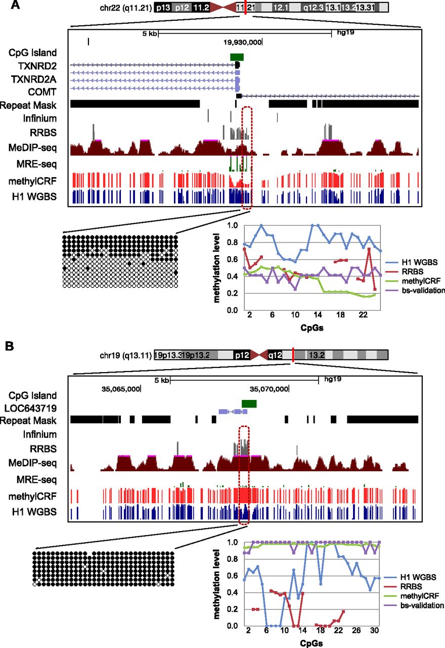 Experimental validation of regions where there is discordance between MethylC-seq and methylCRF. Genome Browser view and site-specific bisulfite sequencing validation for each region (○ unmethylated CpG; • methylated CpG). The line graph shows the methylation levels estimated by MethylC-seq, RRBS, bisulfite validation, and methylCRF. (A) chr22: 19929336–19929659; MethylC-seq predicted on average a methylation level of 80% methylated, while methylCRF and bisulfite validation agreed on a level of 40% methylated. (B) chr19: 35068305–35068683; MethylC-seq predicted on average a methylation level of 60% methylated, while methylCRF and bisulfite validation agreed that the region is more than 90% to completely methylated.