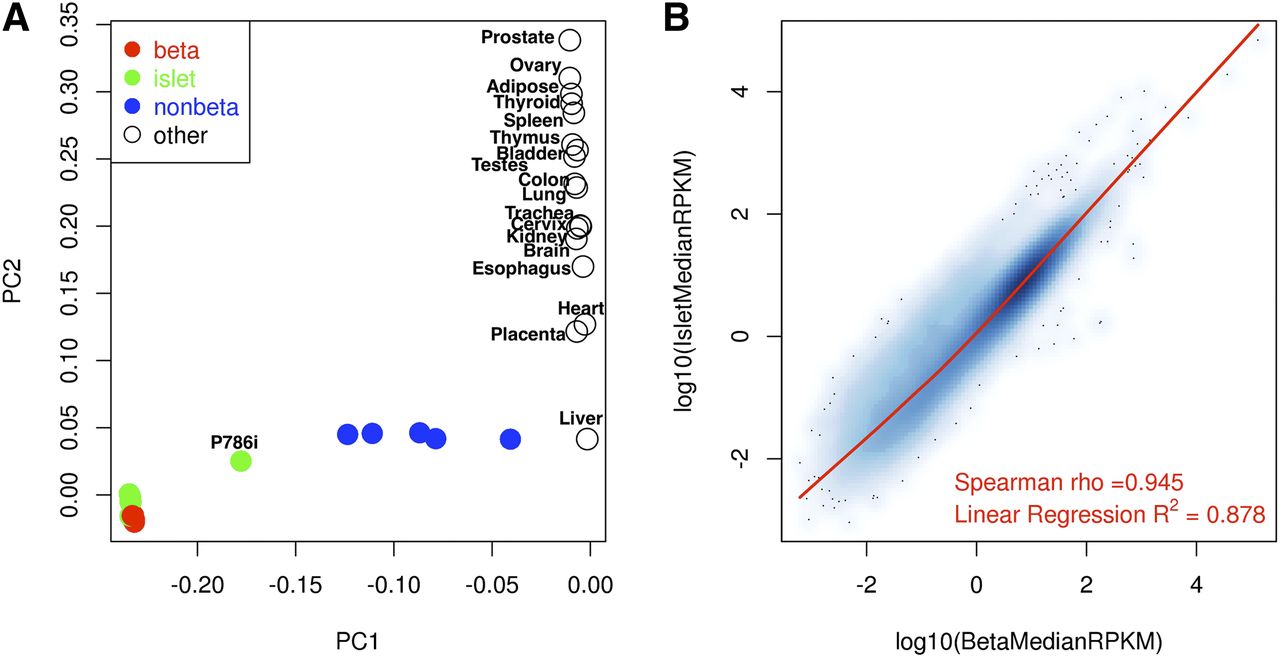 High overall similarity between beta cell and islet gene expression. (A) PCA analysis of gene RPKMs for beta (N = 11), islet (N = 7), nonbeta (N = 5) preparations, and 18 other tissues from unrelated individuals. Beta cell and islet samples cluster together, separating from nonbetas. The other tissues cluster separately, with liver being the most similar to the islet-derived RNA-seq data. (B) Scatterplot of beta cell versus islet median RPKMs on log10 scale.