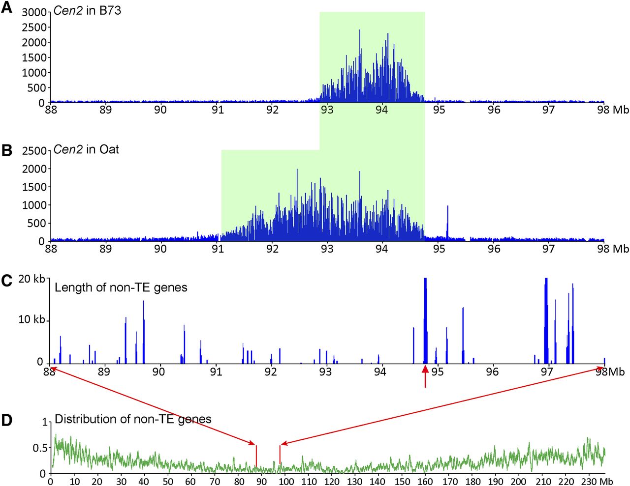 Expansion of Cen2 of B73 in the genetic background of oat. (A) The CENH3-binding domain (green box) of Cen2 in B73. The ChIP-seq read number (y-axis) was calculated in 10-kb windows per million reads. (B) The CENH3-binding domain (green box) of Cen2 in oat-maize chromosomal addition line OMA2.51. (C) The length (kb) of non-TE genes in 20-kb sliding windows (step = 10 kb). The red arrow points to a 58.2-kb transcribed gene located 23 kb away from the CENH3-binding domain. (D) Distribution of non-TE genes along maize chromosome 2. Details of gene distribution within the 88–98 Mb region are exemplified in C.