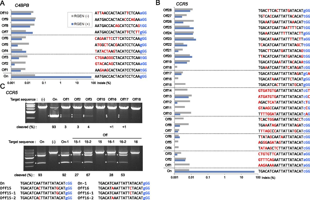 Mutation frequencies at on-target and potential off-target sites of the C4BPB- and CCR5-specific RGENs in K562 cells. (A,B) Cells were transfected with crRNA, tracrRNA, and the Cas9 plasmid or the Cas9 plasmid alone (negative control). PCR amplicons that span the on-target site and potential off-target sites were subjected to deep sequencing. Sequences that contained indels around the expected cleavage site were considered to be RGEN-induced mutations. Mismatched bases are shown in red. The PAM sequence is shown in blue. (C) In vitro cleavage assay of on-target or potential off-target sequences by the CCR5-specific RGEN. Plasmids that contain putative off-target (upper) or hybrid (middle) sequences were digested with the recombinant Cas9 protein complexed with crRNA and tracrRNA. Asterisks indicate cleaved DNA bands. (Bottom) DNA sequences of the on-target, off-target, and hybrid sites.