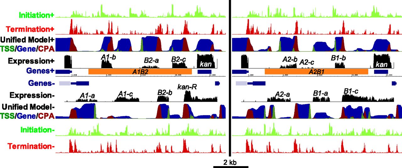 Predicted transcript structure and measured expression of two of the four randomly generated 6-kb fragments. Tracks as in Figure 4, except that “Expression” was measured using custom Agilent tiling arrays. The construct names are indicated in the center, and discernible transcripts are labeled along the tiling array data. A1B1 and A2B2 constructs are shown in Supplemental Figure 8 and show very similar results.