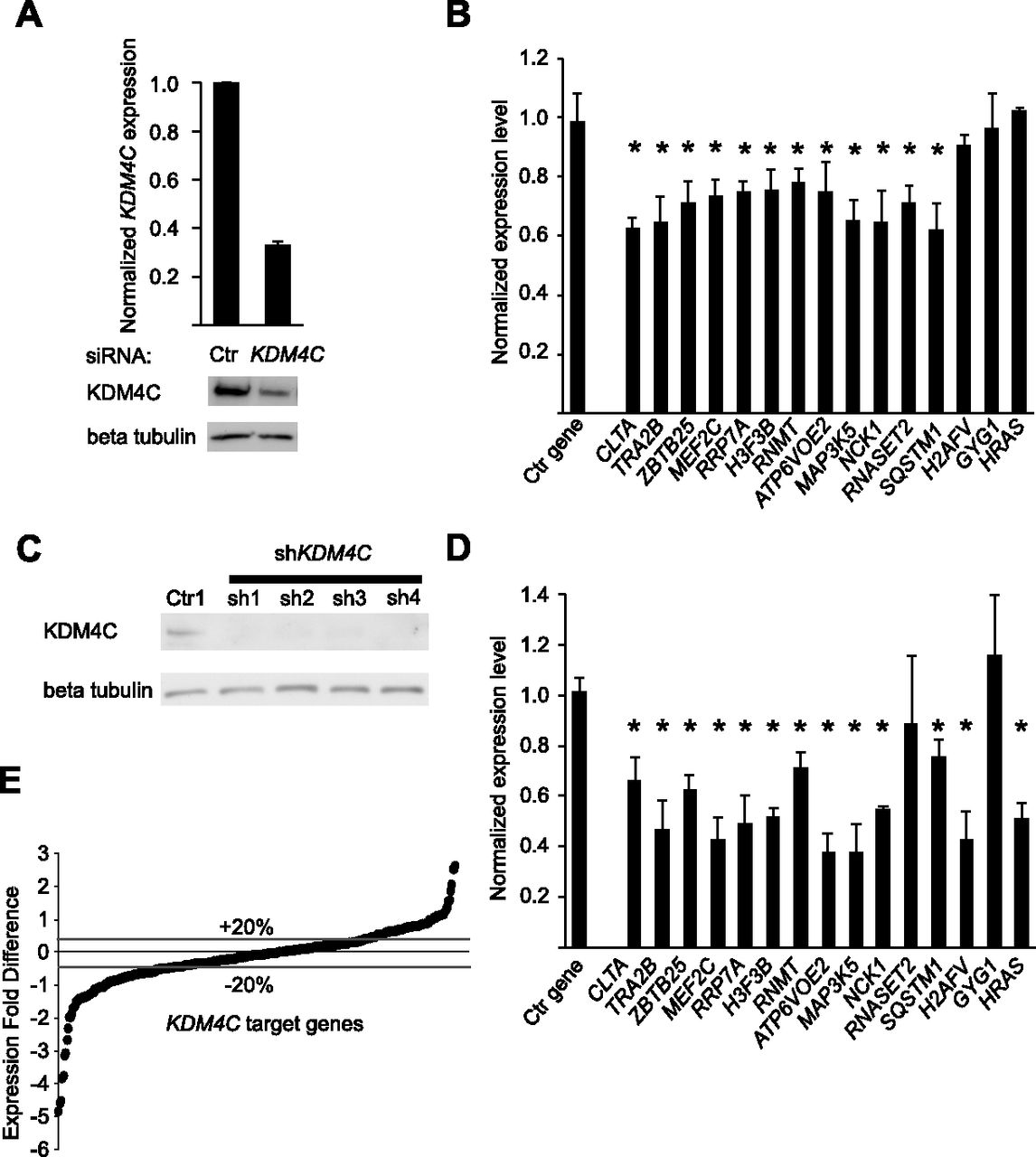 Molecular validation of KDM4C target genes in B cells and primary fibroblasts. (A) B cells from four individuals were treated with siRNA targeting KDM4C or a control siRNA. (Top) qRT-PCR data confirming KDM4C depletion at the transcript level; (bottom) a representative Western blot. (B) Gene expression changes in B cells from four individuals for 15 target genes, measured by qRT-PCR, following KDM4C knockdown. RPS6 is the control gene. Error bars, SEM ([*] P < 0.05, t-test). (C) Western blot of cells transfected with shRNA constructs targeting KDM4C or a control shRNA confirms knockdown of KDM4C in primary skin fibroblasts. (D) Gene expression changes of 15 target genes in primary fibroblasts by qRT-PCR following stable knockdown of KDM4C using the four shRNA constructs from C. RPS6 is the control gene. Ctr indicates control. Error bars, SEM ([*] P < 0.05, t-test). (E) Gene expression changes in 340 target genes measured by microarrays following KDM4C knockdown with sh1 (two biological replicates, in duplicate). Data from two additional shRNA constructs showed highly similar results (P < 0.001) (Supplemental Fig. S2B,C).