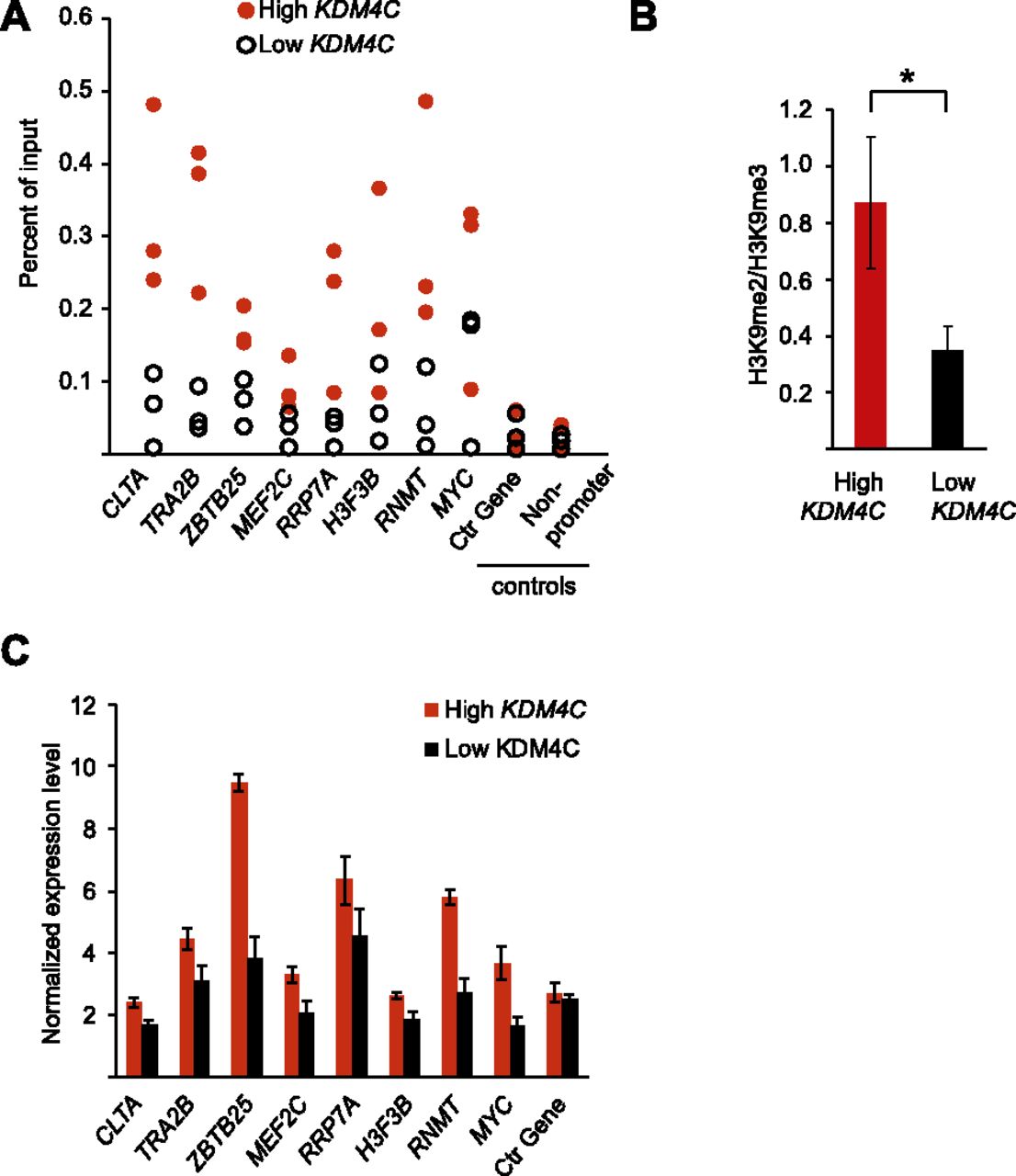 KDM4C expression influences target gene expression levels. (A) Chromatin immunoprecipitation (ChIP) for KDM4C at target gene promoters in B cells from three individuals with high and three individuals with low KDM4C expression. The negative controls are the promoter of RPS6 and an intronic region. (B) The ratio of H3K9me2 to H3K9me3 at the eight target genes in A is shown for individuals with high KDM4C expression compared with low KDM4C expression (n = 3 per group). (C) Target gene expression levels in seven individuals with high KDM4C expression compared with seven individuals with low KDM4C expression, by qRT-PCR. RPS6 is used as the control gene. P < 0.05 for all target genes except RRP7A (t-test). Error bars, SEM.