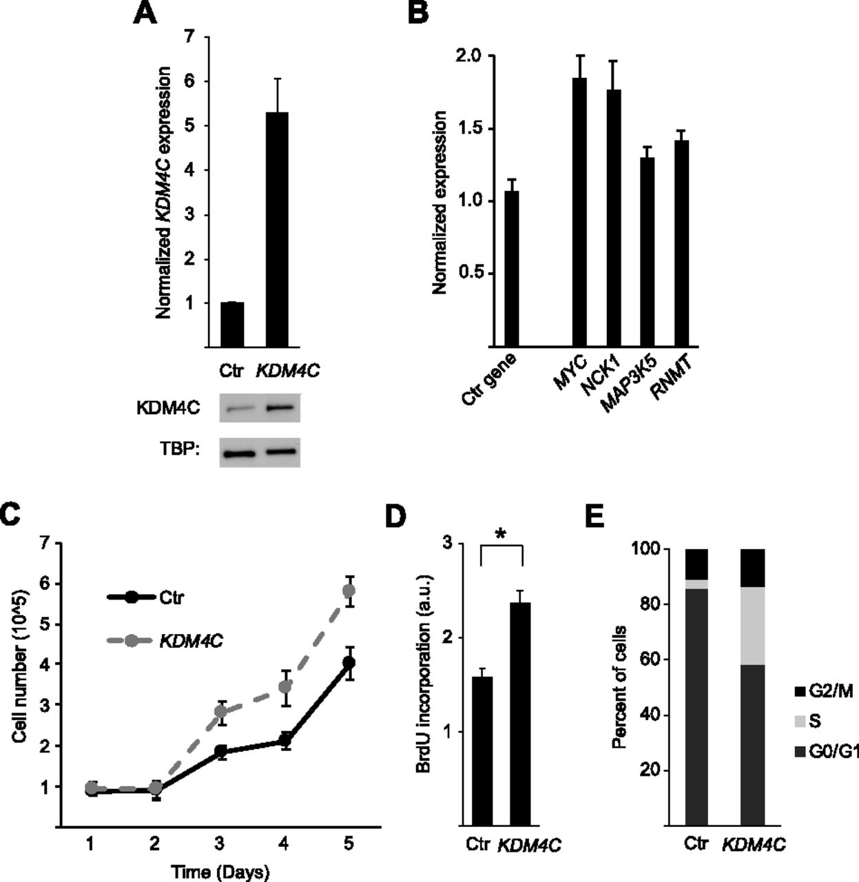 KDM4C overexpression accelerates cell growth. (A) Overexpression of KDM4C in primary fibroblasts was confirmed by qRT-PCR and Western blot relative to control cells. (B) Target gene expression changes following KDM4C overexpression in primary fibroblasts (RPS6 is used as a control). (C) Cell growth following KDM4C overexpression was measured by growth curve analysis (measured in quadruplicate; P = 0.003, ANOVA). (D) BrdU incorporation was measured in triplicate relative to control cells ([*] P < 0.05, t-test). (E) Changes in the proportion of cells at different stages of the cell cycle following KDM4C overexpression. Ctr indicates control cells. Error bars, SEM.