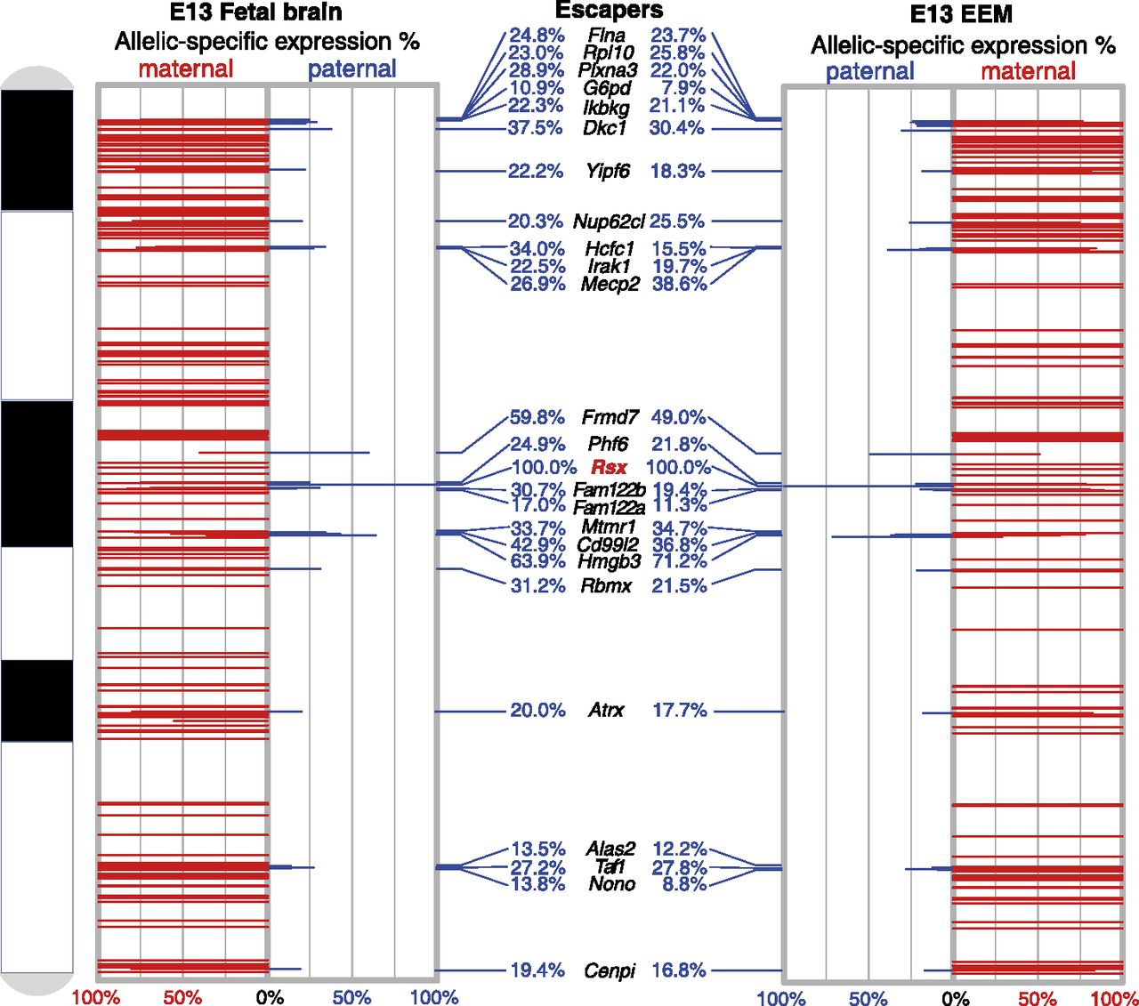 Chromosomal locations and allelic expression profiles of opossum X-linked genes in fetal brain and EEM. The x-axis shows allelic expression percentages: maternal expression on the left, and paternal expression on the right. The y-axis is the physical location of each gene along the opossum X chromosome (centromere at top). (Red bars) Maternal expression percentage; (blue bars) paternal expression percentage. The names of 24 genes that escape pXCI with >10% paternal expression (escaper genes) are indicated in the middle panel. The noncoding Rsx transcript gene (bold, red type) shows 100% expression from the paternal allele in both tissues.