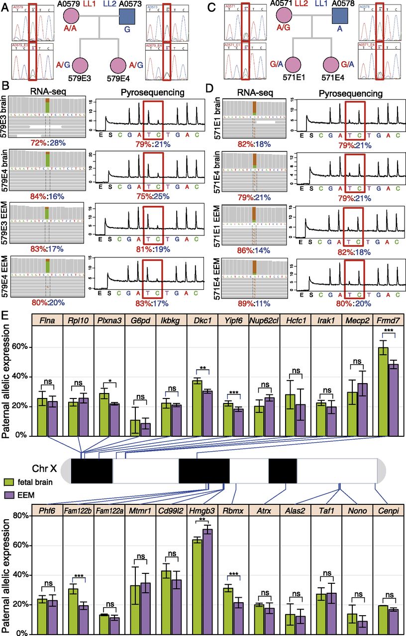 Maternal versus paternal allelic expression ratios for 24 pXCI escaper genes in opossum female fetal brain and EEM. (A–D) SNP genotyping and pyrosequencing verification for example escaper gene Yipf6 in opossum fetal brain and EEM. Sanger sequencing genotypes confirmed that exonic SNP OMSNP0155110 was informative in all four F1 embryos: (A) A0579E3 and A0579E4 in LL1 (dam) × LL2 (sire) cross; (B) A0571E1 and A0571E4 in the reciprocal F1 cross LL2 (dam) × LL1 (sire). (C,D) Biallelic expression verified by RNA-seq (left) and allele-specific pyrosequencing strategies (right). The results for all 24 escaper genes, a non-escaper gene, and an autosomal control gene can be found in Supplemental Figures S4–S28. (E) Names, physical locations, and allelic expression percentages for the 24 escaper genes identified from RNA-seq on the opossum X chromosome (centromere to the left). For each gene, the mean and standard deviation of paternal-allele expression, as a percentage of total expression, is plotted for fetal brain (green) and EEM (purple). Statistical significance, indicated by asterisks, was assessed by a Mann–Whitney U-test; (ns) P-value > 0.05; (*) P-value < 0.05; (**) P-value < 0.01; (***) P-value < 0.001.