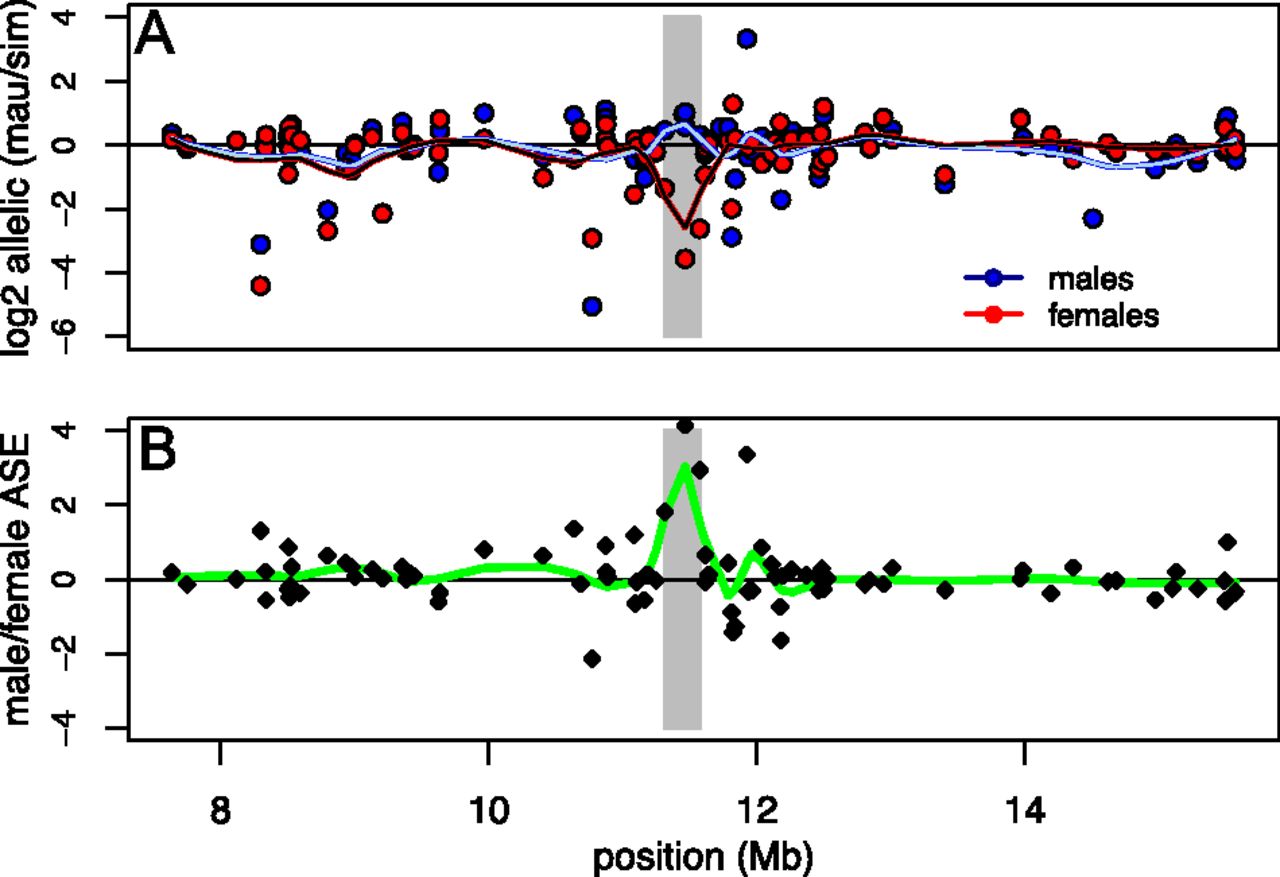 Allele-specific expression among genes assayed by pyrosequencing within the introgressed region. (A) Log2 ratios of allelic expression (D. mauritiana/D. simulans) in males and females. Trend lines were obtained by loess smoothing using a span of 0.2. The candidate region containing local sexually dimorphic cis-regulatory effects is indicated in gray. (B) Differences in allelic expression between males and females as a function of location. The trend line was obtained by loess smoothing using a span of 0.2. The candidate region with sexually dimorphic cis-regulatory effects is apparent as a net excess of D. mauritiana allelic expression in males, due to strong overexpression of the D. simulans allele in females.