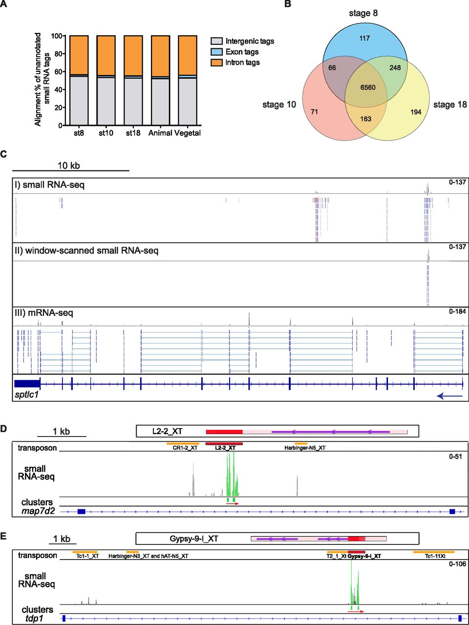 siteRNAs are conserved, cluster in introns, and align to TE remnants. (A) The percentage of unannotated small RNA tags that map to intergenic regions, exons, and introns (using RefSeq gene annotation) is shown for the stage 8, 10, 18, stage 10 animal, and stage 10 vegetal libraries. (B) Venn diagram showing the number and overlap of genes with small intronic noncoding RNAs in the stage 8, stage 10, and stage 18 libraries. (C) Small RNA alignments and mRNA-seq alignments (tracks I–III) to the sptlc1 gene at stage 10 shown in the Integrated Genome Viewer (IGV). Exons are indicated by dark blue boxes, introns by blue lines, and an arrow shows the direction of transcription. Small RNA tags are colored red for a sense alignment and blue for an antisense alignment to the genome, respectively. The gray histograms show peaks of read density with the scale indicated (e.g., 0–137 reads, track I). Track I shows small RNA-seq data before filtering by window-scanning analysis to reveal regions of high siteRNA density (track II). Track III shows mRNA reads, which align to exons. Reads that map over an exon–exon boundary are connected by a blue line. (D,E) Diagrams are shown for map7d2 and tdp1 to indicate the relationship between the siteRNA clusters and the TE remnants present in the introns. The representation of the genes is as in C. Small RNA reads are shown in the track labeled “small RNA-seq” in gray, or in green for those which passed the window scanning filter. The scale indicated is as in C. The green bars below indicate individual siteRNA clusters and the red arrow indicates the direction of transcription of the small RNA reads. In the track labeled “transposon,” the TE remnants are shown as colored boxes, with the names given below. The TE remnant from which the siteRNAs are derived is shown in red, and this entire TE is shown to scale above. The red box in the TE is the region of almost identical sequence to the intronic TE remnant. The purple line shows the protein-coding region and the arrow gives the direction of transcription of the entire transposon. Note that the small RNA reads are antisense relative to the direction of TE transcription.