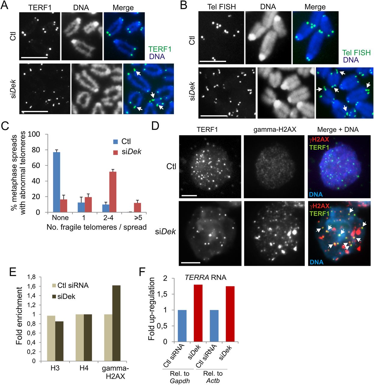 DEK depletion in ESCs induces fragile telomeres. Immunofluorescence detection of TERF1 (A) and telomere FISH analysis of telomere structure (B), on metaphase chromosomes from control and DEK-depleted cells. In control cells, TERF1 and telomere FISH show single signals of similar intensity on both sister chromatid ends. DEK depletion leads to chromatids with double or multiple TERF1 and telomere FISH signals with some stretched signals (arrows). (C) Proportions of metaphase spreads with fragile telomeres induced by DEK depletion (mean ± SD of three experiments; n = 105 cells). (D) Immunolocalization of gamma-H2AX in relation to telomeres (TERF1) in control and DEK-depleted cells. Arrows point to telomeres enriched in gamma-H2AX. Bars, 5 μm. (E) ChIP-qPCR analysis of gamma-H2AX enrichment at telomeres in control and DEK-depleted cells (mean fold enrichment of three experiments). Histones H3 and H4 were also chromatin immunoprecipitated as controls. (F) RT-qPCR analysis of telomere-encoded TERRA RNA transcripts in control and DEK-depleted cells.