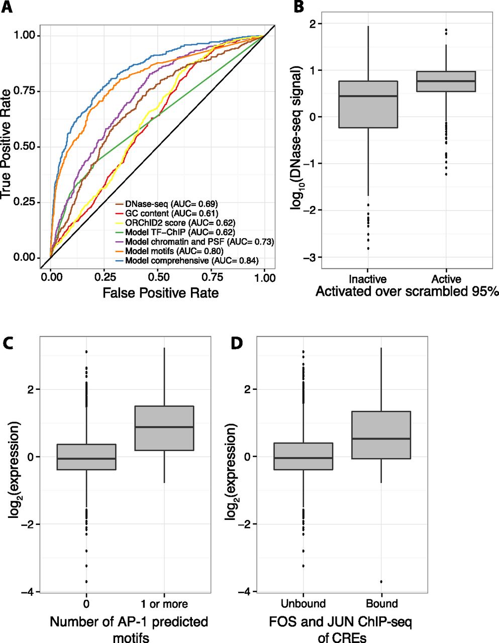 Chromatin features and sequence-specific binding identify active sequences. (A) Receiver operating characteristic (ROC) curve shows that a logistic regression model (“Model comprehensive”) incorporating sequence-specific binding motifs, chromatin features, primary sequence features (PSFs), and TF-ChIP data is best able to identify active sequences. Of logistic regression models with fewer features, one with sequence-specific binding motifs (“Model motifs”) does best, followed by a model incorporating chromatin and primary sequence features (“Model chromatin and PSF”), and a model with only significant TF-ChIP features (“Model TF-ChIP”). Minor groove width as predicted by ORChID2 score, GC content, and DNase I HS are also shown. Area under the curve (AUC) is indicated in legend. (B) Boxplot showing that active CREs are enriched in high DNase I HS signal over inactive CREs. (C) Boxplot showing that CREs with at least one predicted AP-1 motif drive expression higher than CREs with no AP-1 predicted motifs. (D) CREs overlapping with ChIP-seq peaks for a FOS (FOS or FOSL1) family member and a JUN (JUNB or JUND) family member, the constituent proteins of AP-1, drive expression higher than unbound CREs.