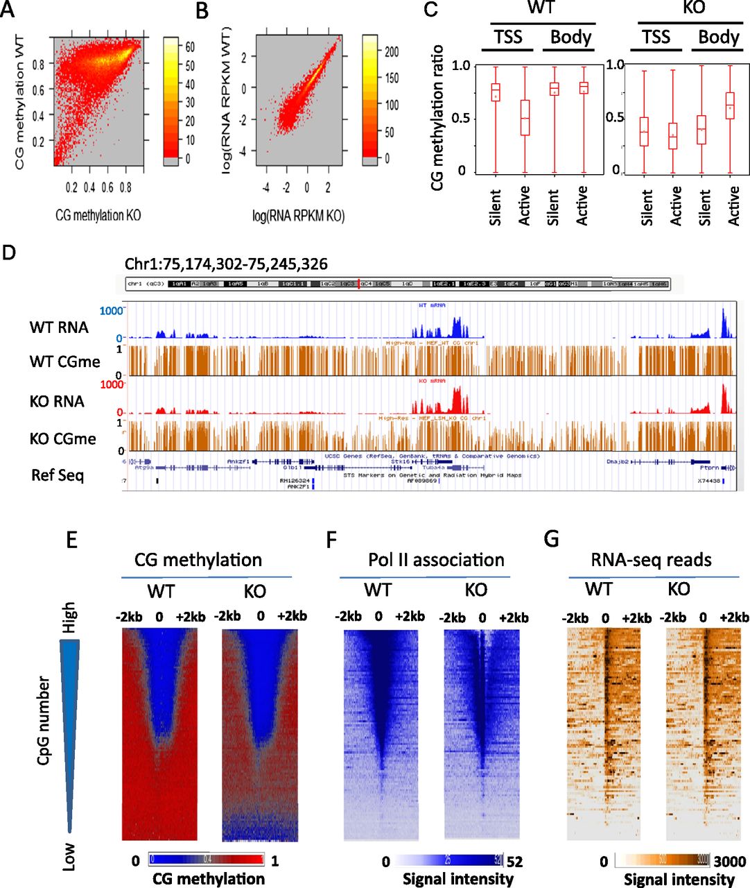 Relationship between relative transcript abundance levels and Pol II at CG hypomethylated promoters in KO MEFs. (A) Heatmap scatterplot analysis presenting the mean values of promoter CG methylation (2 kb upstream of and downstream from the TSS) in WT MEFs and KO MEFs. (B) Heatmap scatterplot analysis representing relative transcript abundance level as read coverage (RPKM values) of RNA-seq analysis comparing WT and KO MEFs. Results of biological replicates are shown in Supplemental Figure S2. (C) Box plot representing mean CG methylation values at gene bodies or TSSs (2 kb upstream of and 2 kb downstream from the TSSs) classified in groups of genes with transcripts (active) and without any detectable transcripts (silent) (Wilcoxon rank test, P < 0.0001). (D) Genome browser view illustrating CG methylation (brown) and transcript abundance level (RPKM values) at representative genes comparing WT (blue) and KO MEFs (red). (E–G) Promoters of protein-coding genes (n = 23,350) are ranked based on the presence of CpG numbers (represented by the triangle to the left). (Bottom) Genes with low CpG density; (top) genes with high CpG density. Heatmap presentation for CG methylation values at 1-bp resolution (E), Pol II ChIP signal intensities at 5-bp resolution (F), and RNA-seq signal intensities at 5-bp resolution (G) around the TSSs and 2 kb of flanking regions for WT MEFs and KO MEFs. Genes are arranged into 100 groups and mean values were computed for each genomic position.