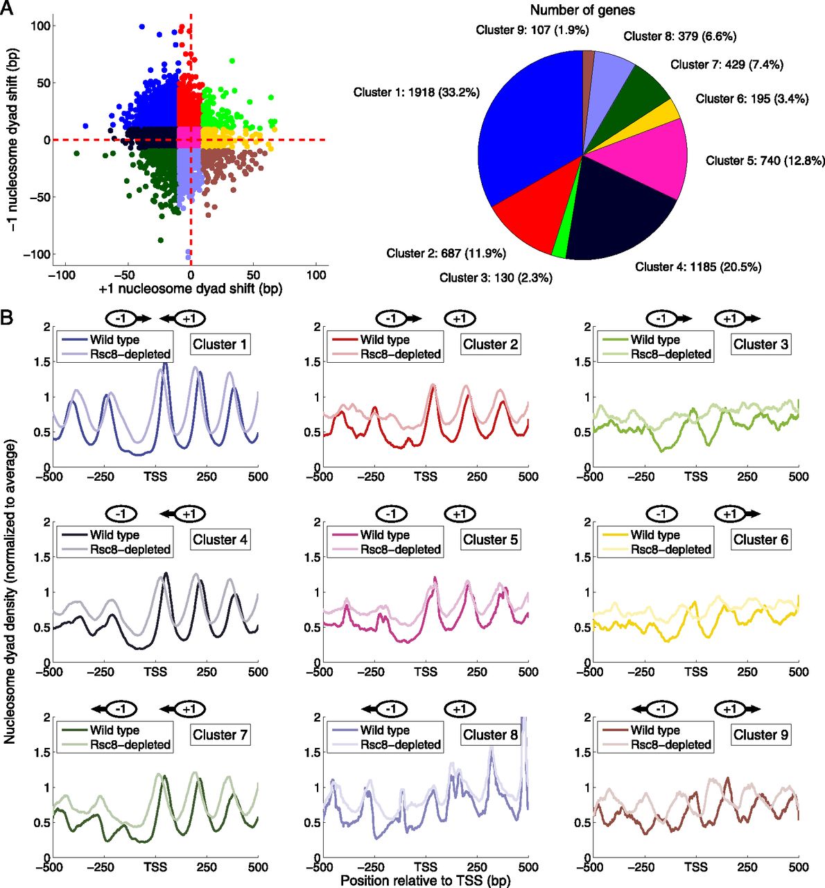 Different classes of altered chromatin structure in Rsc8-depleted cells. (A) Scatter plot representing the shift in the +1 nucleosome dyad versus the shift in the −1 nucleosome dyad for each gene in Rsc8-depleted cells relative to wild type. A negative shift indicates an upstream movement of the nucleosome in Rsc8-depleted cells. The genes are color-coded to define nine clusters of genes, according to whether the +1 and −1 nucleosomes shift upstream or downstream, or remain in place (shift <10 bp). The pie chart indicates the fraction and number of genes in each cluster. (B) Average nucleosome dyad density profiles in a 1-kb window centered on the TSS for each of the nine gene clusters defined in A. The profiles were smoothed using a moving average filter with a span of 21 bp. The cartoon at the top of each panel indicates the direction of displacement of the +1 and −1 nucleosomes.