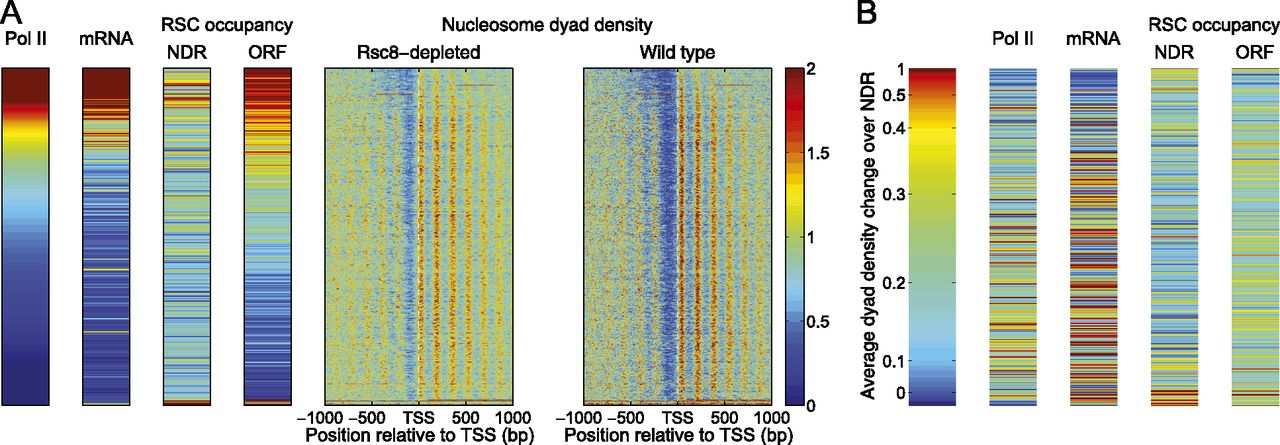 Preferential binding of RSC to heavily transcribed coding regions. (A) Correlation between Pol II density and RSC binding to coding regions. Genes were sorted according to their average ChIP signal for the CTD of Pol II over the transcription unit (left panel) (data from Elfving et al. 2014), such that the genes with the highest Pol II density are at the top. Expression data (Holstege et al. 1998), RSC occupancy data (ChIP for TAP-tagged Rsc8) at NDRs or coding regions (Floer et al. 2010), and our nucleosome dyad phasing data for wild-type and Rsc8-depleted cells are plotted in the same gene order. (B) Rsc8 depletion has the strongest effect on the NDRs of weakly transcribed genes. Genes were sorted according to increase in average NDR dyad density in Rsc8-depleted cells relative to wild type, such that the most affected genes are at the top (sorted as in Fig. 3A). Pol II density, expression data, and RSC occupancy data for the NDR and coding regions are plotted in the same gene order. Heat maps and plots were smoothed as described in the legend to Figure 3.