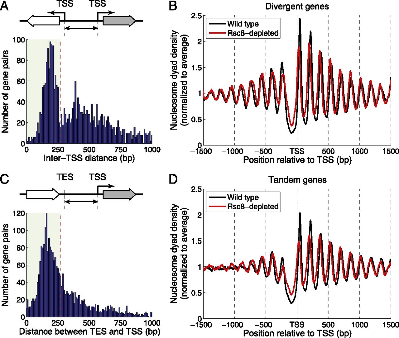Upstream nucleosomes in Rsc8-depleted cells shift toward the NDR regardless of the orientation of the upstream gene. (A) Histogram of inter-TSS distances for divergent genes. (B) Average nucleosome dyad density profiles for divergent genes with inter-TSS distances <270 bp (shaded box in A). (C) Histogram of distances between TES and TSS for tandem genes. (D) Average nucleosome dyad density profiles for tandem genes with TES–TSS distances <270 bp (shaded box in C). In B and D, gene pairs are aligned to the TSS of the downstream gene.