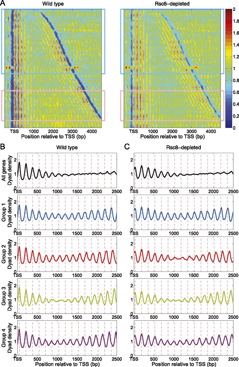 Phase interference analysis of convergent gene pairs. (A) Heat maps representing pairs of convergent genes with inter-TSS distances <5 kb, in wild-type and Rsc8-depleted cells. Gene pairs containing potential phasing elements (replication origins [ARSs], centromeres, LTRs, snRNA genes, snoRNA genes, and tRNA genes) were removed from the list. Gene pairs were sorted by inter-TSS distance. Heat maps were smoothed with a 2D symmetric Gaussian filter with standard deviation σ = 15. Rectangles denote convergent gene pairs with inter-TSS distance <3 kb (blue rectangle) and between 3.5 and 4.5 kb (pink rectangle). (B,C) Interference patterns for convergent gene pairs with inter-TSS distances <3 kb (blue rectangle in A). Top panels show the average for all of these convergent gene pairs. The lower four panels correspond to four phase groups 1–4, representing gene pairs with phase differences of 0 (in phase), 40, 80 (almost exactly out of phase), and 120 bp, respectively (all ±20 bp). (B) Wild type. (C) Rsc8-depleted cells. Note that the four groups contain different genes because of the nucleosome shifts into the NDR represented by the value of Δ (Fig. 7A). The average dyad plots were smoothed using a moving average filter with a span of 51 bp.