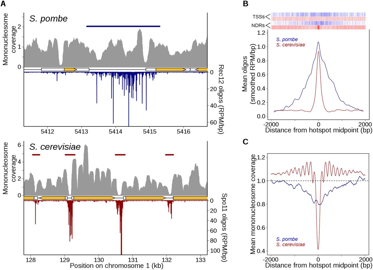 Markedly different relationship between DSBs and chromatin structure in S. pombe and S. cerevisiae. (A) Rec12 oligos are not especially enriched in NDRs, unlike Spo11 oligos. High-resolution mononucleosome coverage maps (MNase-seq) from meiotic S. pombe (Soriano et al. 2013) and S. cerevisiae (Pan et al. 2011) cells were compared with their respective oligo maps for representative regions on each organism’s chromosome 1. Nucleosome maps were normalized by taking the number of times each base pair was sequenced and dividing it by the mean genome coverage (i.e., the mean genome coverage is 1). Horizontal blue and red bars indicate hotspots. Orange arrows mark protein-coding genes and white boxes indicate transcripts. (B) Fission yeast hotspots are much wider than budding yeast hotspots and not generally centered on TSSs or NDRs. Rec12- and Spo11-oligo hotspot midpoints were aligned and the mean oligo distributions were smoothed with a 201-bp Hann window. Relative positions of annotated meiotic NDRs (Soriano et al. 2013) and TSSs (Lantermann et al. 2010) in S. pombe are indicated by blue ticks at top; S. cerevisiae NDRs and TSSs (Jiang and Pugh 2009) are in red. (C) Unlike Spo11-oligo hotspots, Rec12-oligo hotspots tend not to be strongly MNase sensitive in meiotic chromatin. Hotspots were aligned as in B and the mean mononucleosome coverage was determined at each position.