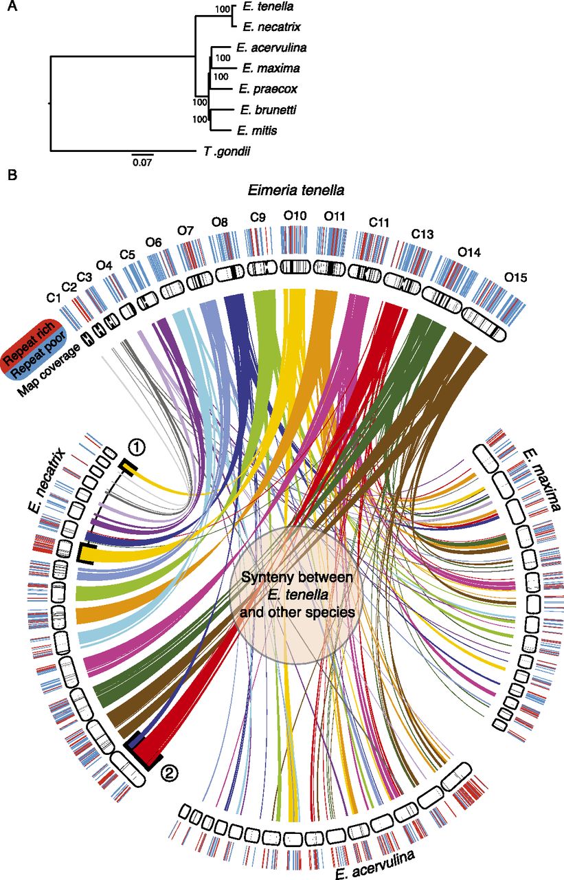 Whole-genome phylogeny and synteny between Eimeria species. (A) Maximum likelihood phylogeny showing the evolutionary relationships between Eimeria species based on alignment of 814 one-to-one orthologs shared with T. gondii. The scale is in substitutions per site. (B) Genomic scaffolds were placed onto optical maps. Black bands show map coverage. Coverage was noticeably better for E. tenella than the tier 2 species. E. tenella maps are named as chromosomes (e.g., C1) where it was possible to reliably identify that chromosome, otherwise they are given their optical map numbers (e.g., O4). Each E. tenella map has been assigned a color and ribbons highlight syntenic regions in the related genomes. E. necatrix is most closely related to E. tenella and correspondingly shows the greatest degree of synteny. The clearest exceptions are (1) O10, which is split between two optical contigs in E. necatrix, and (2) O8, which is similarly split. Map coverage is lower in E. acervulina and E. maxima and this gives the impression that there is a great deal of novel sequence in these species. However, this is largely the result of differential representation of the genomes in their respective maps. Each map is annotated with repeat-poor (blue) and repeat-rich (red) regions ≥30 kb. This highlights the barcode-like patterning across the whole of each genome.
