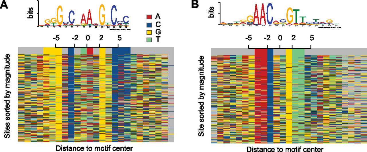 The binding motif can be observed in the sequence that surrounds the predicted binding site. This figure depicts the high resolution of our method. Each row indicates the sequence surrounding a predicted motif center. Different colors represent a different DNA letter. Results are shown for two distinct ChIP-seq experiments performed for the M. tuberculosis transcription factor DosR (A) and Kstr (B). A small shift at the motif center was allowed to improve visualization. Average shift was < 2 bp and is visualized by gray colors.