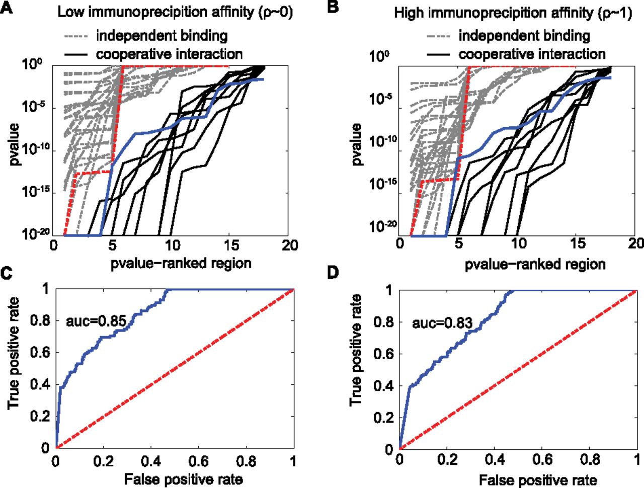 The double-binding signal allows the detection of cooperative interaction from the ChIP-seq data. Our method (Equation 8) is able to distinguish regions containing cooperative interacting sites from regions containing independent binding sites. A set of regions with experimentally validated cooperative interaction is used as a positive control (Chauhan et al. 2011). The negative control is obtained from simulation (Supplemental Figs. S3, S4; Supplemental Table S2; also see Methods). (A,B) The P-value output of our method is able to discriminate regions with cooperative interaction (solid lines) from regions with independent binding (dashed lines). Each dashed line represents a different simulated set. Each solid line assumes a different value for the probability of nonbinding configuration (see Methods). The probability of nonbinding configuration is a necessary input to compute the statistical P-value. Independent of the value for nonbinding configuration, our method discriminates the data well. A good discriminative power occurs even for the most conservative case (highlighted by the dashed red and solid blue lines). (C,D) The overall performance of our method is measured in terms of true versus false positive rate. The solid blue line represents the results from A or B. The dashed red line shows what is expected by chance. The area under the curve (AUC) measures the discriminative power of the method. All results support our method. In addition, the method is robust when performance evaluation is specific to each probability of nonbinding configuration (Supplemental Figs. S5, S6). The results at the left (A,C) and right (B,D) panels are obtained assuming low or high immunoprecipitation rate, respectively.