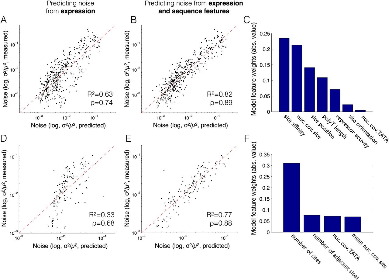 A linear model based on promoter sequence features predicts a large fraction of the mean-independent component of the noise. (A,B,D,E) Shown is a comparison of the predicted (x-axis) and measured (y-axis) noise for a model that predicts noise using only mean expression (A,D) and for a model that also incorporates promoter sequence features (B,E). Results are shown for promoters with a single Gcn4 site (A,B) or multiple sites (D,E). The noise of each promoter was predicted using a model that was trained on the four subsets that did not include the promoter, out of five equally sized subsets among which we split the data. Pearson’s R-squared value (R2) and Spearman’s rank correlation coefficient (ρ) are shown in each model plot (A,B,D,E). (C,F) The weights of the sequence features used in the linear models presented in B and E (the weight of the expression mean is not shown). The weights correspond to the absolute value of the relative contribution of each feature to the prediction of the noise component that is independent of the mean.