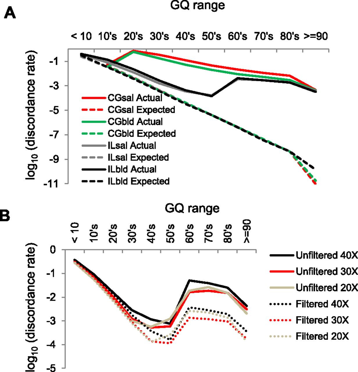 Expected and actual genotype discordance rates as a function of GQ (genotype quality) score. (A) Illumina (IL) and Complete Genomics (CG) sequences from saliva (sal) and blood (bld) samples. (B) IL discordance, with or without SNP filters, and for different depths of coverage.