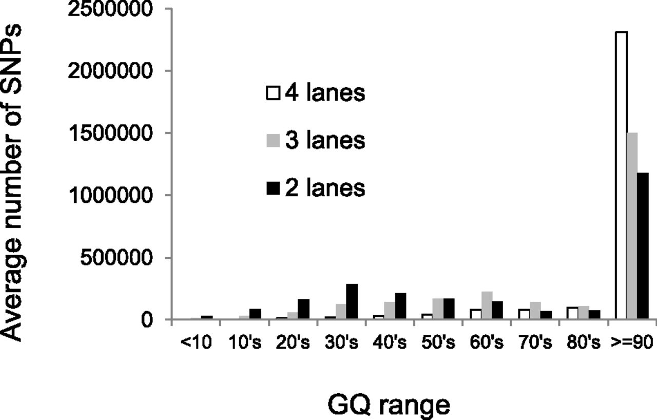 Average number of SNVs called per sample, stratified by GQ score (x-axis) and average level of coverage. Each “lane” corresponds to 32 GB of total sequence.