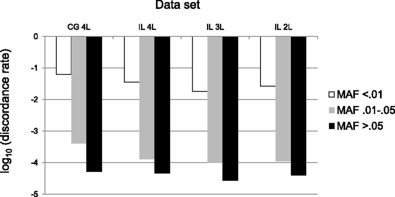 Genotype discordance rate for whole-genome data stratified by minor allele frequency (MAF) for different sequencing platforms (IL, Illumina; CG, Complete Genomics) and levels of coverage (4L, four lanes; 3L, three lanes; 2L, 2 lanes).