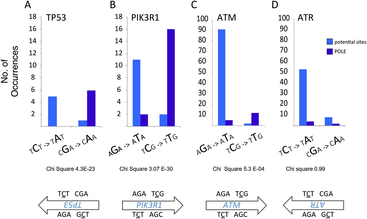 POLE-exo* mutations lead to enrichment of nonsense mutations at tumor suppressor genes in endometrial and colorectal tumors. Comparison of potential nonsense sites that occur in POLE-exo* context (TCT/AGA →TAT/ATA and TCG/CGA →TTG/CAA) to actual nonsense mutations found in POLE-exo* tumors. Selected tumor suppressor genes are shown. The number of potential nonsense mutation sites are shown in light blue; the nonsense mutation sites that actually occurred in POLE-exo* tumors are in dark blue. (A) TP53 (χ2 P = 4.3 × 10−23); (B) PIK3R1 (χ2 P = 3.07 × 10−30); (C) ATM (χ2 P = 5.3 × 10−4); (D) ATR; the POLE-exo* mutations are evenly distributed among the potential sites (χ2 P = 0.99). (See also Supplemental Tables S2, S3 for full amino acid change tables.)