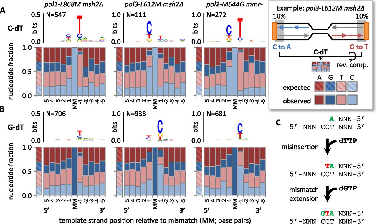 Sequence specificity of replication errors in the absence of MMR. (A) Nucleotide fractions and sequence logos (Schneider and Stephens 1990; Crooks et al. 2004) for five bases upstream of and downstream from mutations resulting from presumed C-dT mispairs, as calculated from sequences flanking mutations near replication origins (see example schematic). Expected fractions assume 38% G + C content. ([MM] Mismatch position; [N] mutation count pooled by strain.) (B) As per A, but for mutations resulting from presumed G-dT mispairs. (C) Example: An incoming mismatched nucleotide (red) stacks with adjacent pyrimidines (green) in the nascent strand, as indicated by logos in A.